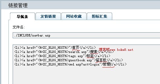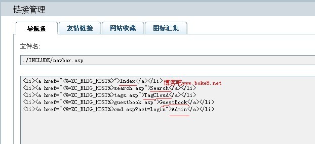 登陆博客后台——链接管理(在侧栏),看到博客导航条显示为英文(划线部分),看图: