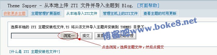 3、点击“浏览”选择本地的主题文件,然后点“提交”,等系统自动释放主题文件完成,安装完毕。看图: