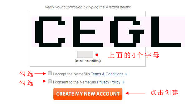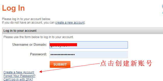 因为我之前有申请过账号并设置了保存账号密码,所以跳转到这个界面的时候会自动填充我的账号密码,直接点下部的“SUBMIT”按钮就行,第一次在namesilo购买的朋友要点击“Create a New Account”按钮(箭头指示部分)新建账号.为了照顾新手,我重新操作一遍.
