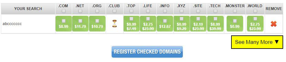 上面列出了域名的各种后缀以及对应的价格(一年).这里我们选择.com的后缀,在$8.99的绿色小框里勾选一下,然后点击下面的蓝色按钮.