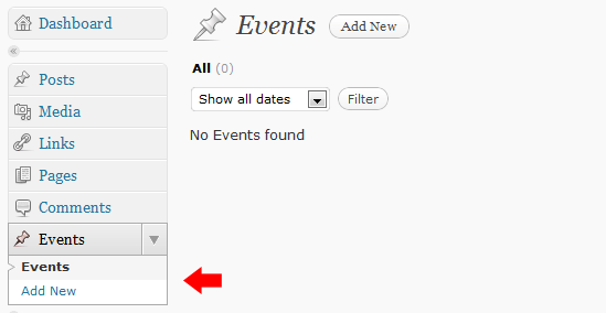 1 2 3 4 5 6 7 8 9 10 11 12 13 14 15 16 17 18 19 20 21 22 23 24 25 26 | add_action( 'init', 'create_events' ); function create_events() { $labels = array( 'name' => _x('Events', 'post type general name'), 'singular_name' => _x('Event', 'post type singular name'), 'add_new' => _x('Add New', 'Event'), 'add_new_item' => __('Add New Event'), 'edit_item' => __('Edit Event'), 'new_item' => __('New Event'), 'view_item' => __('View Event'), 'search_items' => __('Search Events'), 'not_found' => __('No Events found'), 'not_found_in_trash' => __('No Events found in Trash'), 'parent_item_colon' => '' ); $supports = array('title', 'editor', 'custom-fields', 'revisions', 'excerpt'); register_post_type( 'event', array( 'labels' => $labels, 'public' => true, 'supports' => $supports ) ); } |
