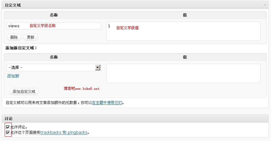 - 自定义域如果主题没有需要是不用管的,但有些主题,如图片主题会用到自定义域,自定义域是WP的一个强大的功能。使用方法:自定义域的字段名称后,点击“添加新..”,然后输入自定义字段的名称,在值的输入框中输入自定义字段的值,然后点击“添加新自定义域”即可。