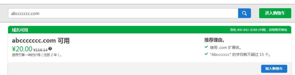 很幸运这个域名没有被别人注册过,还可以申请注册.这时候先按耐住激动的心情,点击右边的加入购物车.跳出来这个界面:
