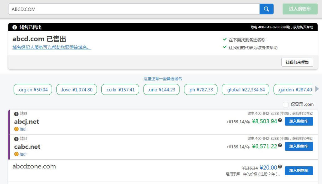 在这里,我们可以看到ABCD.COM这个域名已经被别人申请注册了,如果ABCD是你必须要的主域名,那么你可以考虑一下选择ABCD.NET,只是很可惜abcd.net这个域名也已经被别人注册掉了,你只能考虑换一个新的域名.比如abccccccc.com