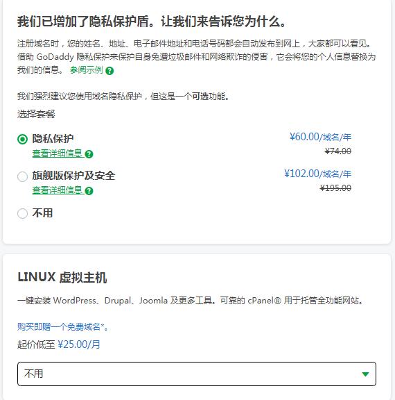 可以根据自己的需要选择隐私保护服务,这里就是godaddy不如namesilo的地方,namesilo是免费的,这也是我后来放弃godaddy选择namesilo的一个原因.至于什么是隐私保护,大体上就是保护你这个域名买主的相关隐私信息,比如手机号等,相关更多的内容我会在其他文章中详细进行说明.厦门的LINUX虚拟主机暂时不需要,我们选择“不用”选项.然后进入了结算界面,如下图