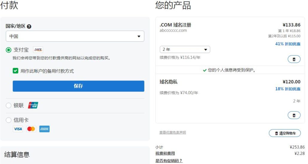 左侧是三个支付选项,出于方便考虑,选择的是支付宝.右边是相关服务内容—两年的域名服务时间(可以自己选择域名服务时间),小计133.86元,以及对应的域名隐私保护120元,一共是253.86元.还记得我刚才说过放弃godaddy选择namesilo买域名的原因吗?这两年120省下来买点肉吃吃,不香啊?!