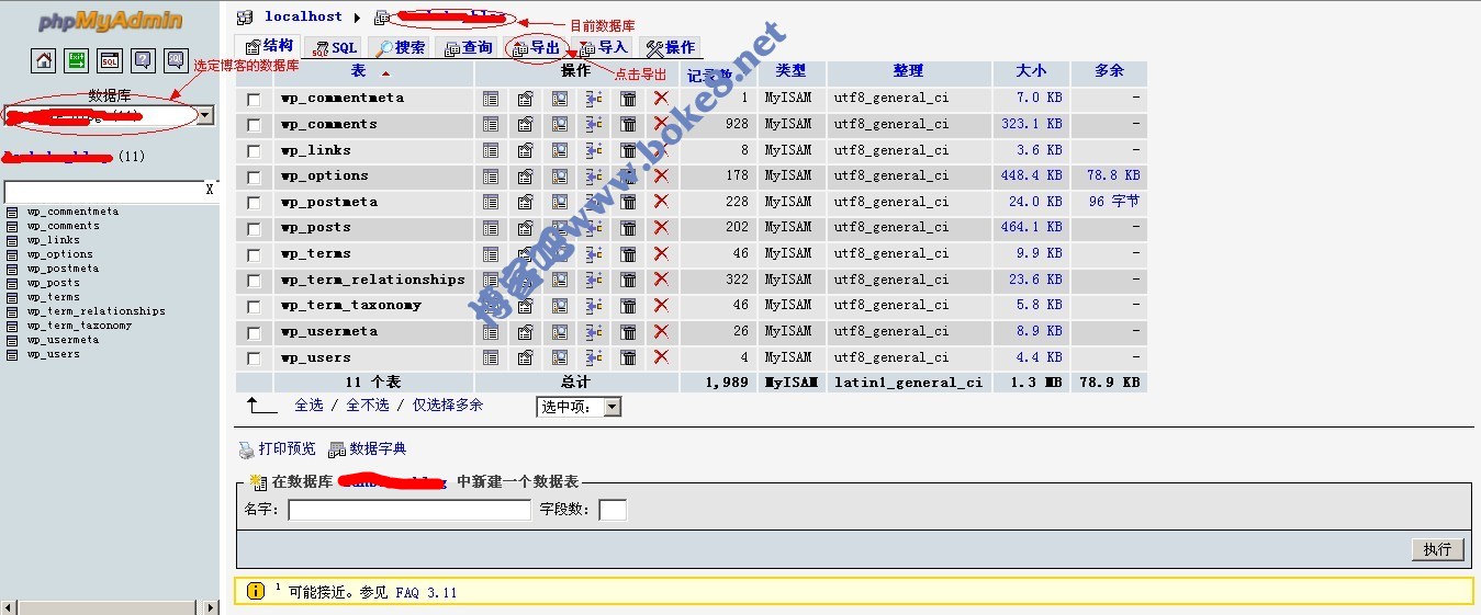 登陆WordPress博客使用的MYSQL数据库的PHPMYADMIN管理,选择博客所使用的数据库,点击“导出”,英文版的为“export”,看图: