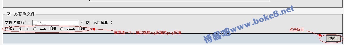 全选中后,在页面底部,选择导出的压缩方式,有三种可选:无、zip压缩、gzip压缩,选好后,点击右下角的“执行”按钮,看图: