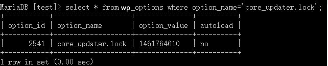 12345 | mysql -u root -puse wordpress;select * from wp_options where option_name='core_updater.lock'; |